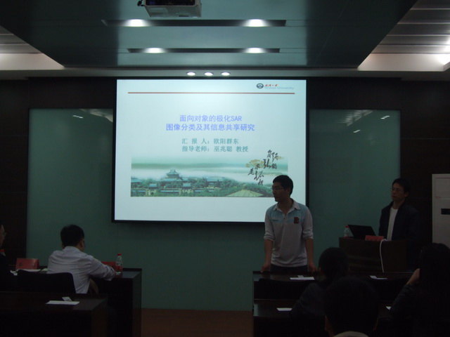 欧阳博士首先介绍了面向对象分类的研究背景和意义,由面向对象分类的优势引申出其研究的总体技术路线。接下来,他详细讲述了基于四分量散射模型的相干滤波算法、顾及散射性的极化SAR图像多尺度分割、结合分水岭变换与支持向量机得极化SAR图像分类、基于CityGML的遥感信息共享与应用这四个关键技术及其创新点。随后,欧阳博士向大家展示了大量的实验分析的结果,充分证明了其算法的高精度。欧阳博士的演讲及其PPT演示内容丰富饱满,让大家对面向对象的分类有了一定深度的了解。受邀嘉宾杨杰教授和秦昆教授对欧阳博士选题的新颖给予很高的赞扬。秦昆教授认为欧阳博士需要在实验数据部分加入国内数据的分析。杨杰教授对欧阳博士提出了改进的建议,他认为散射机制需要细分,面向对象所解决的问题需要设定。