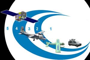 两条弧线把空间划分为两蓝三白的区域,由近及远分别代表着不同距离的遥感平台,包含但并不局限于地面遥感、低空遥感、航空遥感、航天遥感;